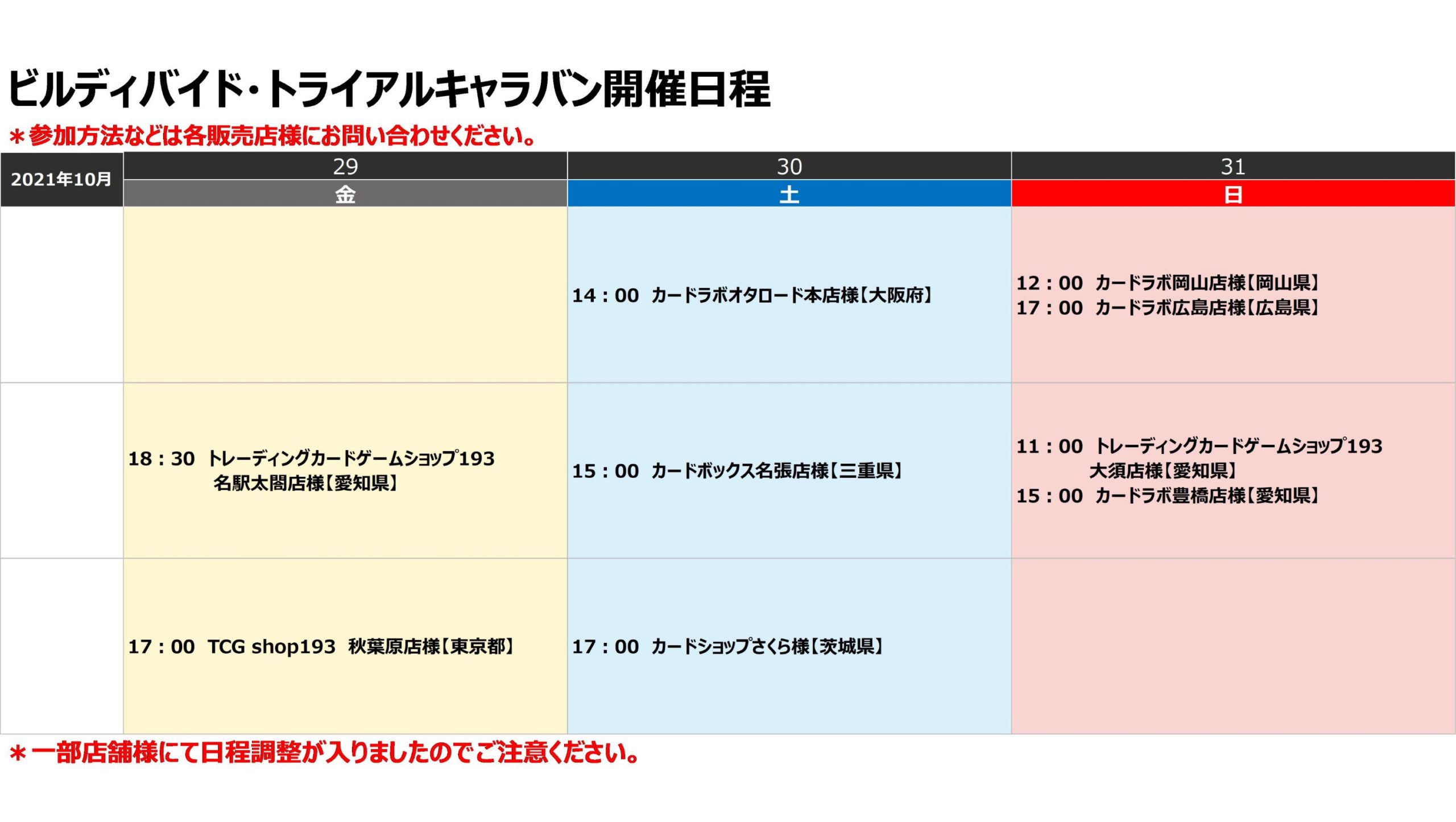 イベント・大会 10月のトライアルキャラバン情報 Ku 2021年10月29日 10月最終のトライアルキャラバン情報! トライアルキャラバンは10月までとなっており今回が最後のチャンスなので今ビルディバイドを始める機会におすすめです。 https://twitter.com/build_divide/status/1453617531835465736?s=19より引用 トライアルキャラバンに参加すると、限定PRカードとスリーブも手に入るぞ!